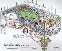 In 1914, the college hired noted landscape architect Frederick Law Olmsted, Jr. with bigger buildings like Olds and Agriculture Halls being built Olmsted faced the challenge of maintaining the informal character of campus while minimizing walking distance. In 1915, the Olmsted Brothers firm issued a report its solution was a dramatic redesign of campus around quadrangles However, the plan was unpopular with students and alumni who wished to maintain the informal parklike feel of campus. After eight years of consulting and little in way of changes the school ended its relationship with Olmsted in 1922.[7]