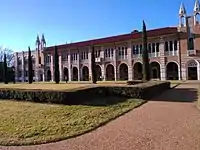 The university's first president, Edgar Odell Lovett, intended for the campus to have a uniform architecture style to improve its aesthetic appeal.[2] Influenced by the campuses of southern Europe, many of Rice's buildings are Mediterranean Revival in style,[2] with sand and pink-colored bricks, large archways and columns acting as architectural motifs. Noteworthy exceptions include the glass-walled Brochstein Pavilion,[7] Lovett College with its Brutalist-style concrete gratings, the eclectic-Mediterranean Duncan Hall, and the modern Moody Center for the Arts.