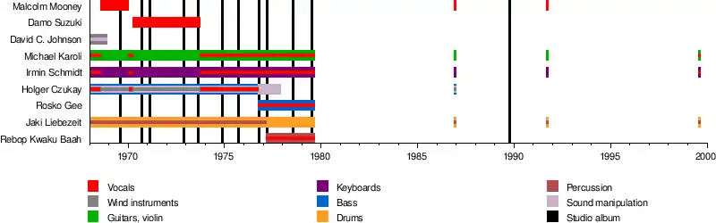 | Past members | Michael Karoli Jaki Liebezeit Irmin Schmidt Holger Czukay Malcolm Mooney Damo Suzuki David C. Johnson Rosko Gee Rebop Kwaku Baah |