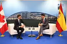 Canada's Minister of Agriculture and Food, Lawrence MacAulay, highlighted an increase in trade relations due to CETA's bilateral project with the EU and assured that both countries "have always been good friends."[11] Canadian Foreign Minister Chrystia Freeland classified the bilateral relations between Canada and Spain as excellent and based on common values, with Canada being one of Spain's strongest allies. Both countries have supported each other in internal problems.[12][13]