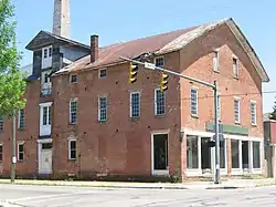 The Canal Warehouse is a historic warehouse at the intersection of Main and Mulberry Streets in downtown Chillicothe, Ohio, United States. Built in 1830,[1] along the Ohio and Erie Canal, this three-story brick building is an ornate gabled structure with large dormers set into both sides of the main roof. These dormers served a purpose far different from decoration: their windows connect with first-floor doors to enable longshoremen easily to move goods into or out of the third floor. On the ground level, individuals can enter the warehouse through either of two recessed doorways; three stone steps climb from the sidewalk to each doorway.[2]