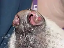 Discoid lupus erythematosus (DLE) is an uncommon autoimmune disease of the basal cell layer of the skin. It occurs in humans[1] and cats, more frequently occurring in dogs. It was first described in dogs by Griffin and colleagues in 1979.[2][3] DLE is one form of cutaneous lupus erythematosus (CLE). DLE occurs in dogs in two forms: a classical facial predominant form or generalized with other areas of the body affected. Other non-discoid variants of CLE include vesicular CLE, exfoliative CLE and mucocutaenous CLE.[4] It does not progress to systemic lupus erythematosus (SLE) in dogs. SLE can also have skin symptoms, but it appears that the two are either separate diseases.[5] DLE in dogs differs from SLE in humans in that plasma cells predominate histologically instead of T lymphocytes.[6] Because worsening of symptoms occurs with increased ultraviolet light exposure, sun exposure most likely plays a role in DLE, although certain breeds (see below) are predisposed.[7] After pemphigus foliaceus, DLE is the second most common autoimmune skin disease in dogs.[8]