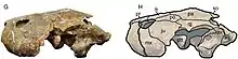 The skull of Caninemys is robust and roughly triangular in shape with thick and massive premaxilla. The eyes are dorsally oriented, facing slightly upward. No nasal bones are present as in other members of Pelomedusoides. Instead the prefrontals make up most of the anterior portion of the skull, including the area just above the nares. The prefrontals extend past the maxilla, giving it a somewhat stub-nosed appearance. The paired prefrontals, frontals and parietals all contact their respective second bone at the midline. The frontals lack the groove that is characteristic for Podocnemis. Scales are preserved on the skull roof, especially over the parietals. Based on this Caninemys had triangular interparietal scales, similar to modern Podocnemis species. The premaxilla are paired, but only make up a small portion of the jaws just below the nares. The triturating (grinding) surface of Caninemys is notably more complex than in modern podocnemidids, with a sharp labial ridge that forms a small but distinct toothlike process at the midline contact of the premaxilla. The premaxilla also form a large recess to accommodate for a hooked lower jaw, as seen in the modern Alligator Snapping Turtle. The maxilla of Caninemys are noticeably enlarged and give the animal a superficially "bulldog-like" appearance. The maxilla also stands out for the large, tooth-like processes formed by the labial ridge and flanking the premaxilla on both sides. These processes, superficially resembling the canine teeth seen in mammals, are very noticeable when the skull is viewed head-on. These two processes, alongside the premaxillary process, account for the tridentate condition that gives Caninemys tridentata its species name. Even without these processes the labial ridge is very pronounced in Caninemys, being thick and extending downward 2 centimers into a flattened edge. The ridge curves upwards close to the maxilla, creating a u-shaped notch. However, Caninemys does not possess a secondary palate like in Bairdemys, Stereogenys and Shweboemys.[1]