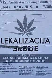 On 18 January 2015 an organization called Lekalizacija Srbije (a conflation of lek meaning medicine and legalizacija meaning legalization), advocating the legalization of medical marijuana was formed in Belgrade by journalist Antonije Kovačević.[13] On 19 February 2015 the organization submitted a proposal to the Ministry of Health to legalize medical marijuana, citing several hundred cases of successful treatment.[14] On 7 July 2015 in Belgrade's Mixer House, Lekalizacija Srbije organized a festival promoting medical marijuana called "One Plant, Many Good Things". One of the speakers was Slavica Đukić Dejanović.[15]