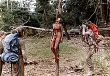 The Italian screenwriter Gianfranco Clerici wrote the script under the working title Green Inferno. He had collaborated with Deodato in his previous films Ultimo mondo cannibale and The House on the Edge of the Park, the latter of which was filmed before Cannibal Holocaust but released afterward. The screenplay included multiple scenes that did not make the film's final cut, including a scene in which a group of Ya̧nomamö cuts off the leg of a Shamatari warrior and feeds him to piranhas in a river. This scene was to take place directly after Monroe's team rescues a smaller group of Ya̧nomamö from the Shamatari.[9] Attempts were made to film this scene, but the underwater camera did not operate properly, and the piranha were difficult to control. As a result, Deodato abandoned his efforts, and still photographs taken during the scene's setup are its only known depiction.[2] The originally scripted version of The Last Road to Hell, which was written to depict soldiers advancing upon an enemy position, also went unused, as Deodato instead decided to use stock footage of political executions for the segment in order to draw further parallels to the films of Jacopetti.[2] The character names Mark Williams and Shanda Tommaso in Clerici's screenplay were also changed to Mark Tomaso and Faye Daniels, respectively, in the film.[9][10]