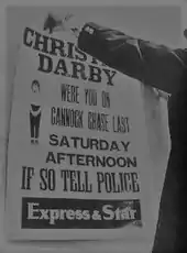 Over the following days, 24,000 flyers bearing Darby's photograph were distributed to the public and displayed in prominent locations such as shop windows, bus stops and telephone poles in and around the West Midlands. Each circular bore the inscription Christine Darby. Were you in Cannock Chase last Saturday afternoon? If so, tell police.[45] One eyewitness reported to police he had seen a grey car travelling in the direction of Cannock Chase shortly after 2:30 p.m. on 19 August. According to this witness, a dark-haired girl had been sitting in the passenger seat.[20]