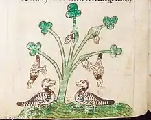 Boece has been accused of writing history that suited his sponsor, James V of Scotland.[32] In many parts of his history of Scotland, Boece draws on medieval explanations based on myth,[33] The lasting feature was that Boece allowed Galloway to express the view that barnacle geese did come from barnacles. The explanation may involve the geese dropping from trees growing on the sea shore fully formed. Or, emerging from barnacles that clung to flotsam. In either case, Galloway was reflecting what was known about barnacle geese in the 16th century. His certainty about religion was under-scored by his certainty about the natural world.