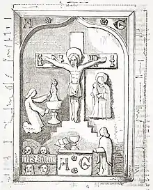 The panel that is now visible, in the ruins, is a copy made in the early 20th century after the original had been removed for restoration and lost in 1903! The original installation would have been painted and decorated with coloured wires. The Cross is adorned with the liturgic sign INRI. That is, IESVS·NAZARENVS·REX·IVDÆORVM (Iesus Nazarenus, Rex Iudaeorum) "Jesus the Nazarene, King of the Jews" (John 19:19). To the left of the cross is the Archangel St Michael the patron saint of Kinkell church. To the right the Virgin Mary. Below, to the left, is a representation Souls in Purgatory. Indicating ”preces sanctorum” – prayers for the dead. To the right, below, a figure that was probably Galloway. His initials and the Marian rose are depicted on the altar as well as on the frame of the plaque. Steven Holmes