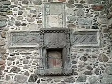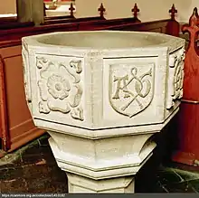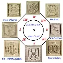 Third, a baptismal font. This can be seen in St John’s Episcopal Church, Crown Terrace in Aberdeen. The bowl is octagonal with sunken panels on each face. This design is striking when compared to other medieval fonts in Scotland.[24] The liturgical signs are as follows: the eight sides of the bowl itself are a reference to the eighth day of Holy Week – the Sunday of the Resurrection and new birth. A striking feature on one side of the bowl is the letters A & G intertwined with a cord.[25] There are in addition on other faces, the Arma Christi (five wounds - the objects associated with Jesus' Passion), two sacred monograms (one being “IHS” - abbreviation of the name ΙΗΣΟΥΣ (Jesus); the other a crowned M for Mary), a pierced heart (the "arms of Mary"), two carved roses and the cross with a crown of thorns. Galloway made extensive use of the Marian Rose in his liturgical signs, as well as being a practicing "Marianist". The bowl, which is 18 in (46 cm) deep and 9.5 in (24 cm) wide has a drain. It now sits on a pedestal which was designed by the Aberdeen architect James Mitchell who provided the setting in 1851 when it was installed in St John's.[26]