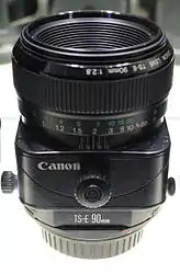 The Canon TS-E 90 mm f/2.8 is a tilt-shift, telephoto prime lens that provides the equivalent of the corresponding view camera front movements on Canon EOS camera bodies. Unlike most other EF-mount lenses, it does not provide autofocus.