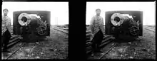 A number of Mle 1893/96 M guns were fitted to the same railroad carriage as the older model in 1917, although it only weighed 60 tonnes (59 long tons; 66 short tons). The gun could elevate between +3° and 40°, but retained the same minimum firing elevation of 10°. It could use the same ammunition as the older guns, but could also fire a new 49.8 kg (110 lb) high-explosive shell fitted with a ballistic cap at a velocity of 830 m/s (2,700 ft/s) to a range of 19,200 m (21,000 yd).[2] Eight of these railroad guns remained in French service after the end of World War I and at least four were captured by the Germans and given the designation 16 cm Kanone (E.) 453(f) although what use was made of them, if any, is unknown.[10]