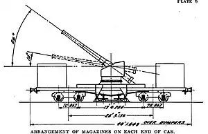 The mount was capable of 360° of traverse at elevations from +10° to +40° with a maximum range of 18 km (11 mi) and was often used for counter-battery fire. At lower elevations, the casemates at either end of the carriage interfered with traverse which limited the gun's firing arc to approximately 90° on each side. Carriages with this capability were known as Tous Azimuts or TAZ for short.[3] The guns used a top-carriage recoil system where the gun sat on a cradle which held the trunnioned barrel. When fired a combination of hydraulic buffers and inclined rails on the firing platform returned the gun to position. Once in position, a section of rail bed was reinforced with wooden beams, the firing platform was unfolded and a combination of screw jacks, outriggers, and rail clamps stabilized the carriage during firing. It shared its railroad carriage with the Canon de 19 modèle 1870/93 TAZ.[4]