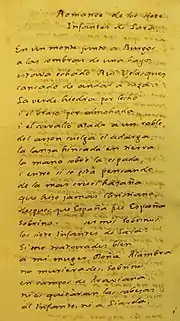 The Cantar de los Siete Infantes de Lara ("Song of the Seven Lara Princes") is a legend, perhaps derived from a lost cantar de gesta, that relates a tale of family feuding and revenge, centering on the murder of the eponymous seven infantes (princes) of Lara or Salas. The legend survives in prose form in medieval chronicles, the oldest being in the extended version of the Estoria de España (History of Spain) compiled during the reign of Sancho IV of Castile before 1289 (edited by Ramón Menéndez Pidal under the name Primera Crónica General).[1]