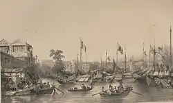 In the mid-1750s, the East India Company realized that the fees and prices were both better at Ningbo; it was also nearer the main centres of Chinese tea production and silk manufacture. The impact of their shift on Guangzhou's tax receipts and a fear of a second Macao being created prompted attempts to force Ningbo to make itself less attractive. When that failed, the Qianlong Emperor issued a 1757 edict closing all ports but Guangzhou's to most Westerners.[13][n 1] In order to keep the traders in the factory area and out of the rest of the western suburbs, the 17 Chinese merchants of the port were obliged to establish the guild known to foreigners as the "Cohong" in 1760,[12] each paying an entrance fee of around 10,000 Spanish dollars (74,000 tls.) and submitting to a levy of about 3% on their future business. Ten of the merchants did so, the fees establishing the Consoo Fund and Hall, walkways, and a new street to which small-scale merchants were obliged to move in order to continue selling to the foreign traders.[n 2] Since the new street was particularly full of porcelain dealers, it came to be known as China Street.[9] The Hong merchants included Howqua (Wu Bingjian), Puankhequa, Mowqua, Goqua, Fatqua, Kingqua, Sunshing, Mingqua, Saoqua, and Punboqua.[15] Despite the existence of Sinophones[15] and the linguists usually accompanying each ship,[4] foreigners were notionally banned by imperial decree from learning the Chinese language,[1] there being officially appointed translators for that purpose.[15] The foreign traders—despite most working for government monopolies themselves—protested strongly at the Cohong's control over prices, advances, and exchange rates and predicted the death of trade with China.[12] In fact, the Cohong helped ensure Chinese production met the traders' needs—some ships had previously been obliged to wait as much as a year to be fully stocked[12]—and by 1769, the area was being expanded to make up for an extreme shortness of apartments.[16] In 1748, there had only been eight factories,[17] but there were seventeen by 1770, a number kept up until the great fire of 1822.[2]