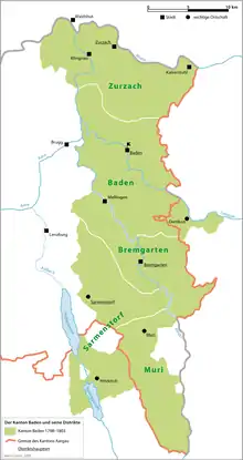 ![]() The Helvetic Republic, as at the constitution of 12 April 1798, showing the Canton of Baden in dark brown, top-centre. | |||||||||||||