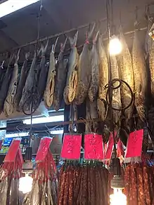 Cantonese salted fish (simplified Chinese: 广东咸鱼; traditional Chinese: 廣東鹹魚; pinyin: Guǎngdōngxiányú; Cantonese Yale: Gwong2 Dung1 Haam4 Yu2; also known as "salted fish, Chinese style") is a traditional Chinese food originating from Guangdong province. It is a fish preserved or cured with salt, and was a staple food in Guangdong. It historically earned the nickname of the "poor man's food", as its extreme saltiness is useful in adding variety to the simpler rice-based dinners. Cantonese salted fish was revealed to be on the list of Group 1 known carcinogens,[1][2] but was suspected and studied for its links to cancer as early as the 1960s[3][4] due to the high incidence of nasopharyngeal cancer, an extremely rare type of nose and head cancer now understood to be linked to a high consumption of this dish.