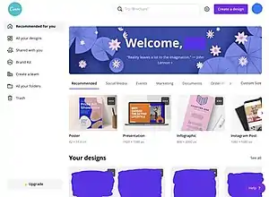 Canva is an Australian graphic design platform, used to create social media graphics, presentations, posters, documents and other visual content.[4][5][6] The app includes templates for users to use. The platform is free to use and offers paid subscriptions such as Canva Pro and Canva for Enterprise for additional functionality.[7] The subscription price for Canva Pro is $119.40 per year for up to 5 people. Canva Pro can be provided to nonprofit organizations for free if they meet the guidelines. The subscription price for Canva for Enterprise is $30 per month per each person.[8] In 2021, Canva launched a video editing tool.[9] Users can also pay for physical products to be printed and shipped.[10]
