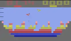 An Atari 2600 port was developed by then-Atari employee David Crane. It uses solid bricks rather than round rocks. Instead of visible point values, each layer of bricks has a color corresponding to its worth. It also includes Sea Bomber game modes where players destroy ships instead of rocks.[3]