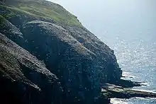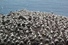 It is home to one of North America's largest seabird colonies. The government of Newfoundland and Labrador estimates that the site is home to 24,000 northern gannets, 20,000 black-legged kittiwakes, 20,000 common murres, and 2,000 thick-billed murres, as well as dozens or hundreds of razorbill, and black guillemot breeding pairs.[2] The ocean waters off the reserve also provides winter habitat for harlequin ducks, common eiders, scoters, and long-tailed ducks. The reserve has been designated an Important Bird Area by BirdLife International.[3]