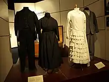 In the collection of the Victoria and Albert Museum various cape dresses can be found. In 1933 Madeleine Vionnet created a woollen jersey dress and matching cape.[7] Coco Chanel designed a dress with matching cape in 1937-8. The dress consisted of silk and net covered with black sequins. It was lined with satin.[8] In 1967 Cristóbal Balenciaga created an evening ensemble consisting of a matching cape and sleeveless dress out of black gazar silk.[9] Philippe Venet created a black-and-white dress with a cape-like collar in 1989.[10]