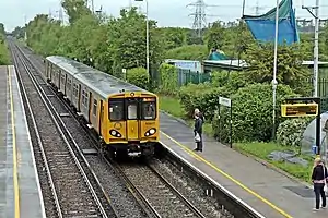Trains between Chester and Liverpool call at Capenhurst every 30 minutes every day (including Sunday). The quarter-hourly service on the Chester line does not benefit Capenhurst since alternate trains run through the station non-stop between Hooton and Bache in each direction.[2] These services are all provided by Merseyrail's fleet of Class 507 and Class 508 EMUs.