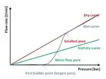 Capillary flow porometry permits obtaining several parameters and information in one individual and fast measurement. In general, a measurements with the wet sample (impregnated with wetting liquid) is carried out first. It is normally known as the "wet run" and the representation of the gas flow vs. the applied pressure is the so-called "wet curve". After the wet run the measurement of the same sample in dry state is carried out in order to register and analogous "dry curve". The half-dry curve is calculated and represented by dividing the flow values with respect to the applied pressure by 2 and it is also represented in the same graphic. From the representation of the three curves it is possible to identify relevant information about the sample: the maximum pore size (or first bubble point) is recorded when gas flow through the sample is detected (please see explanation about FBP above), the mean flow pore size corresponds to the pore size calculated at the pressure where the wet curve and the half dry curve meet (it corresponds at the pore size at which 50% of the total gas flow can be accounted), and the minimum pore size results from the pressure at which the wet and the dry curve meet (from this point onwards the flow will be the same because all the pores have been emptied).