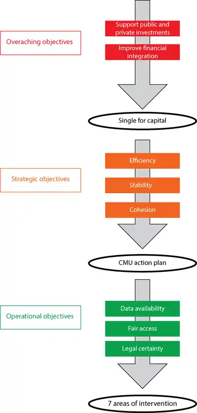 The European Commission designed 3 different levels of objectives for the Capital Markets Union, from the global economic goals to the more concrete necessity for the construction of an integrated financial system. These economic objectives frame the six intervention areas encompassed by the action plan.[22]