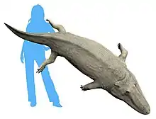 Like the mentioned Xenotosuchus, the genus Wetlugasaurus is also one of the smaller and less known mastodonsaurids.[13] It had a skull that measured around 22 centimetres (8.7 in), and reached a total length of at least 1 metre (3 ft 3 in), and although it is pretty large compared to modern-day amphibians, Wetlugasaurus is still very small compared to most of the other mastodonsaurids.