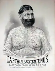 Captain George Costentenus, also known as "The Greek Arvanite"[1][2] or "The Tattooed Greek Prince",[3][4] (April 17, 1833 - ?) was a circus performer in the late 1800s. A man who was tattooed over his entire body, he was a famous traveling attraction who claimed to have been kidnapped by Chinese Tartars and tattooed against his will. His surname was sometimes spelled as Constantenus and Constantinius. He was also known as Djordgi Konstantinus and Georgius Constantine.