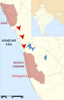 Roman Catholics from the South Canara district on the south-western coast of India, under the jurisdiction of the Mangalore Diocese, are generally known as Mangalorean Catholics.[10] They are Konkani people who speak the Konkani language.[11] All earlier records of South Canara's Christians were lost at the time of their deportation by Tipu in 1784 and it is not known when Christianity was introduced in South Canara. It is possible that Syrian Christians settled in South Canara as they had in Malabar, a region south of Canara.[12] During the 13th century Italian traveller Marco Polo recorded that there were considerable trading activities between the Red Sea and the Canara coast. Scholars have surmised that foreign Christian merchants were visiting the coastal towns of South Canara during that period for commerce, and that some Christian priests possibly accompanied them in their evangelical work.[13] In 1321, the French Dominican friar Jordanus Catalani of Severac in south-western France, arrived in Bhatkal, North Canara.[14] According to historian Severine Silva, no concrete evidence has yet been found that there were any permanent settlements of Christians in South Canara before the 16th century.[13]