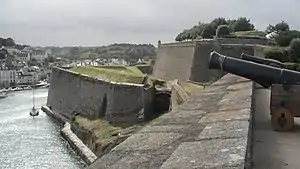 Realising what had happened, Crauford abandoned his attack and took his troops via boat around to assist Lambart. The British commanders poured further reinforcements in to secure the beachhead. By nightfall the whole British force was ashore. According to a pre-arranged signal the French forces and inhabitants withdrew into the main fortification at Le Palais leaving the rest of the island to the invaders.[11] The British now occupied the island's defenceless ports allowing them to ship in fresh supplies, and began to besiege Le Palais. The French commander on the island, the Chevalier Sainte Croix, hoped that he would be able to resist at Le Palais long enough for some relief to reach him from the French mainland. The French Governor of Brittany, the Duc d'Aiguillon had gathered a force at Vannes with the intention of coming to the aid of Belle Île, but British frigates kept a vigilant watch of the coast, and the British control of the surrounding seas made any chance of a crossing unlikely. The French government moved fresh reinforcements to mainland Brittany, suspecting that this would be the next target to be attacked.[12]