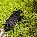 Carabus gigas is the largest European ground beetle, reaching a length of about 40–70 millimetres (1.6–2.8 in). The upper surface is black and glossy. The elytrtra are oval, strongly convex and covered with about 15 rows of more or less small tubercles. Also the pronotum has a granular surface. The adults reach the age of 3 years or more. These beetles primarily feed on snails.