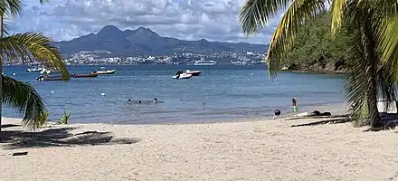 The scenic Carbet Pitons range occupy an 8 km long area of outstanding natural beauty through the centre of the island, and include some of its highest peaks, though Martinique's highest point Mount Pelée is not part of the range. The singularly steep peaks of the Carbet Pitons range, a defining landmark of Northern Martinique's landscapes, form a series of volcanic andesite domes and peaks covered with thick, pristine rainforests towering above the bay and city of Fort de France.