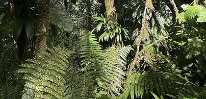 At its lowest altitudes and downwind, the zone presents submontane rainforest formations, replaced at higher altitudes by the topographic facies of the tropical mountain rainforest. This is mainly located on narrow, steeply sloping interfluves, but also in less steep areas of the slopes. In addition, at the highest altitudes, the cloud forest is densely populated with endemic species including bryophytes, Praestoea montana and/or tree ferns. To the summits or in very exposed areas, dense thickets are very diverse and rich in endemic species. These summit areas boast almost pure populations of rare orchids such as Bracchionidium sherringii). Finally, the most unstable terrains show a high level of herbaceous formations also containing rare or endemic species such as the small fern Odontosoria flexuosa, endemic to the Lesser Antilles and victim of erosion of the tracks.[3]