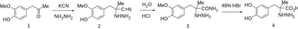 The synthesis begins with a modified Strecker reaction using hydrazine and potassium cyanide on arylacetone (1) to give 2. This is then hydrolyzed with cold HCl to give carboxamide 3. More vigorous hydrolysis with 48% HBr cleaves the amide bond and the aryl ether group to produce carbidopa (4).