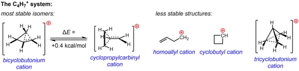 Three other possible structures, two classical structures (the homoallyl cation and cyclobutyl cation) and a more highly delocalized non-classical structure (the tricyclobutonium ion), are now known to be less stable isomers (or merely a transition state rather than an energy minimum in the case of the cyclobutyl cation).[35]