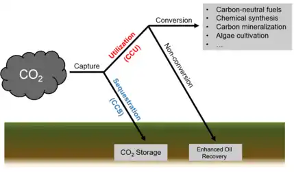 Carbon capture and utilization (CCU) is the process of capturing carbon dioxide (CO2) to be recycled for further usage.[1] Carbon capture and utilization may offer a response to the global challenge of significantly reducing greenhouse gas emissions from major stationary (industrial) emitters.[2] CCU differs from carbon capture and storage (CCS) in that CCU does not aim nor result in permanent geological storage of carbon dioxide. Instead, CCU aims to convert the captured carbon dioxide into more valuable substances or products; such as plastics, concrete or biofuel; while retaining the carbon neutrality of the production processes.