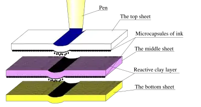 Carbonless copy paper (CCP), non-carbon copy paper, or NCR paper (No Carbon Required, taken from the initials of its creator, National Cash Register) is a type of coated paper designed to transfer information written on the front onto sheets beneath. It was developed by chemists Lowell Schleicher and Barry Green,[1] as an alternative to carbon paper and is sometimes misidentified as such.