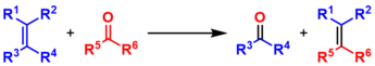 Carbonyl olefin metathesis is a type of metathesis reaction that entails, formally, the redistribution of fragments of an alkene and a carbonyl by the scission and regeneration of carbon-carbon and carbon-oxygen double bonds respectively. It is a powerful method in organic synthesis using simple carbonyls and olefins and converting them into less accessible products with higher structural complexity.[1]