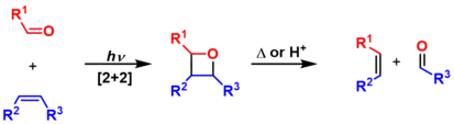 The carbonyl–olefin metathesis reaction can proceed stepwise under photochemical conditions, where in the first step irradiation by a light source induces a [2+2] cycloaddition between a carbonyl and olefin, known as the Paternò–Büchi reaction. The isolated oxetane intermediate can subsequently be fragmented into a new carbonyl and olefin product under thermal or acidic conditions.[2]