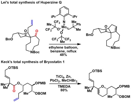 For Type A transformation, stoichiometric amount of molybdenum or tungsten complex was often used to generate the metal alkylidene intermediate. In Lei's total synthesis of Huperzine Q,[4] they have furnished the cyclopentene ring through carbonyl-olefin metathesis using Schrock molybdenum alkylidene complex. As for Type B transformation, the alkene intermediate was usually formed through treating the carbonyl functional group with reagents like titanocene methylidene, Tebbe, Grubbs, Petasis reagents or in situ generated titanium alkylidenes.[5] Keck and coworkers showcased the utility of in situ generated titanium alkylidene to perform carbonyl-olefin metathesis in their preparation of the C-ring fragment of bryostatin 1[6]