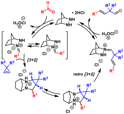 In 2012, the Lambert group has reported a ring-opening metathesis of cyclopropenes with aldehydes using a simple hydrazine catalyst through a [3+2]/ retro [3+2] cycloaddition sequence.[7] A detailed mechanism for this metathesis process is described below: the catalytic cycle started with the condensation of aldehyde R1CHO with hydrazine catalyst, and then the reactive intermediate underwent cycloaddition with cyclopropene. After proton transfer, retro-[3+2] took place which gave the desired hydrazonium intermediate. The subsequent hydrolysis liberates the metathesis product and regenerated catalyst. Cyclopropenes worked smoothly but norbornene and stilbene among other olefins did not undergo metathesis with aldehydes under the same conditions.
