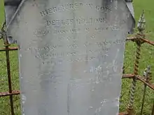 The graves are arranged in clearly definable family plots. Until comparatively recently. these were each bordered by a neat fence. This may reflect the rural nature of the site and the desire to keep grazing animals away from burials, thus preserving the dignity of the graveyard. However, possibly in the 1980s, fences and the metal rails and markers were removed in order to facilitate mechanical mowing. Holes indicating the position of these can still be seen in the hard earth. One grave, that of Lizzie Benfer, is topped by an ornate carving of an angel, but the majority of the monuments are of the upright slab type, most favouring an austere simplicity of style. Several are inscribed with lengthy texts or poems. Recent burials are marked only by small, uniform metal plates.[1]