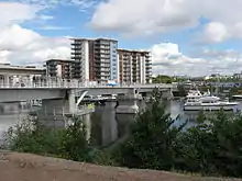 Costing approximately £5 million, Pont y Werin (English: People's Bridge) is a bridge crossing the River Ely, allowing pedestrians and cyclists to travel between the International Sports Village (ISV) and Penarth. It has significantly enhanced non vehicular access to the site by allowing the public to travel to the ISV via Cogan railway station.[10] It also completes the six and a half mile Bay circular walk. Construction of the 140 m (460 ft) pedestrian and cycle bridge, designed by Faber Maunsell and Holder Mathias architects, commenced in summer 2009 and it opened to the public in July 2010. The four main sections, which weigh between 38 and 46 tonnes, were lowered into place by the 1,200-tonne crane, the largest in the UK, in late March 2010.[11] Funding for the new bridge came from the Welsh Government (£1.645m), Cardiff Council(£1.3m), Sustrans (£1.15m), Cardiff Harbour Authority (£250,000) and £200,000 from the Vale of Glamorgan Council. Sustrans used part of a £50m award it received from the Big Lottery Fund in 2007 after winning a national TV vote.[11]