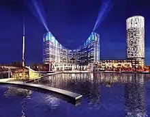 On 22 January 2009, Rodney Berman made a further announcement, saying all future projects, including the arena, snow box, bars, restaurants and hotel were on hold until the economic situation improved.[21] This came after developers announced in December 2008 they had scrapped the flagship Bay Pointe high rise apartment scheme,.[22] These funding shortfalls served to underline the flawed nature of the project, being overly dependent on too few developments which were never certain to go ahead, such as the super casino.