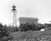 Cayo Cardona's dwelling was designed of stone and brick for one 2nd class keeper. A 33-foot (10 m) circular tower was attached to its south facade. The structure measures some 48' x 30' x 16'. Its main entrance is on the north facade which opened into a room arrangement similar to the other minor structures of the light house and described further below. The fact that no plans of this structure have been found, and that its interior has been closed off with cement makes it difficult to describe. Only secondary references, a late 19th-century photo of the site, and official references to the similar or identical design of the minor lights allows a reserved description of this particular site.[4]