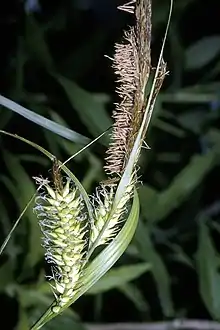 In addition to lake sedge, other non-scientific names include common lake sedge,[9] lakebank or lake-bank sedge,[10][1] hairy sedge,[10] and rip-gut sedge.[9] Its common name in French is carex lacustre.[11]