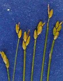 Carex leptalea is a species of sedge known by the common names bristly-stalked sedge and flaccid sedge. It is native to much of North America including most of Canada, the Dominican Republic, and the United States.[1] It only grows in wetlands. This sedge produces dense clusters of thin stems up to 70 centimeters tall from a network of branching rhizomes. The thin, deep green leaves are soft, hairless, and sometimes drooping. The inflorescence is up to 16 millimeters long but only 2 to 3 millimeters wide, and is yellow-green in color. There are only a few perigynia on each spikelet, and they are green and veined.