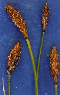 Carex subnigricans produces stems no taller than about 20 centimeters from a network of thin rhizomes. The thin leaves are rolled tightly and resemble quills. The inflorescence is generally oval and pointed in shape and one or two centimeters long.