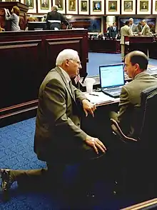 He was the first state or federal elected official to serve in Operation Iraqi Freedom while also holding elected office. Baker's colleagues in the House tied a yellow ribbon around his chair on the House floor, which remained in place until he returned. In 2004, the Florida Legislature unanimously passed House Bill 1757, the Carey Baker Freedom Flag Act.[7] This act amended Florida law to require that every classroom in any public K-20 educational institution must display the American flag on a daily basis. The flag must be made in the United States and must be properly displayed in accordance with United States Code. The law mandated that the required flags be displayed in each classroom no later than August 1, 2005.[8]